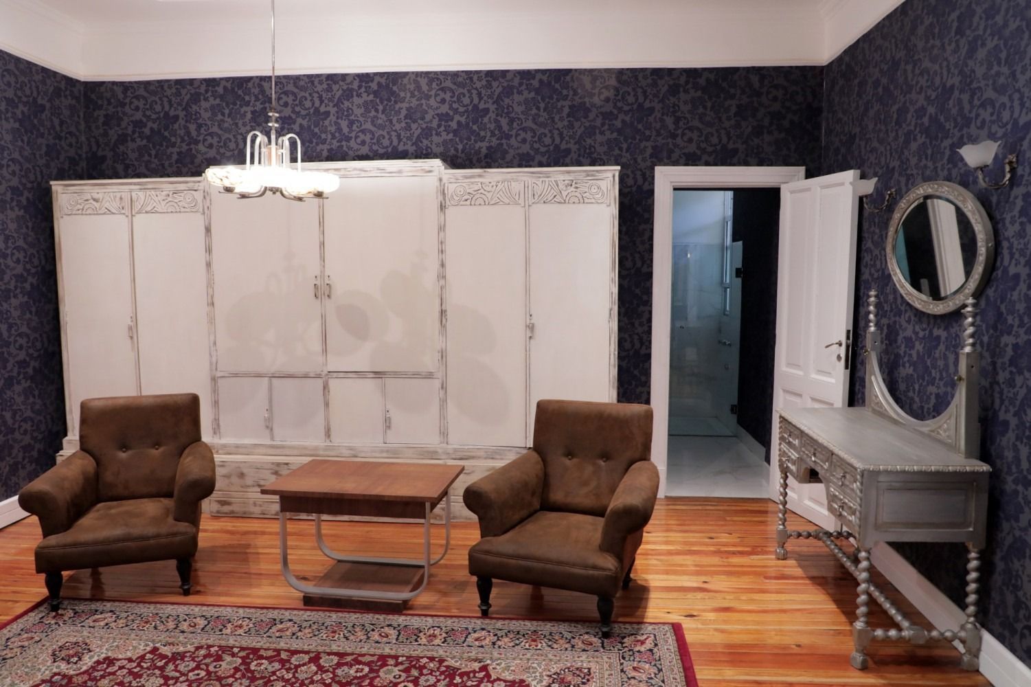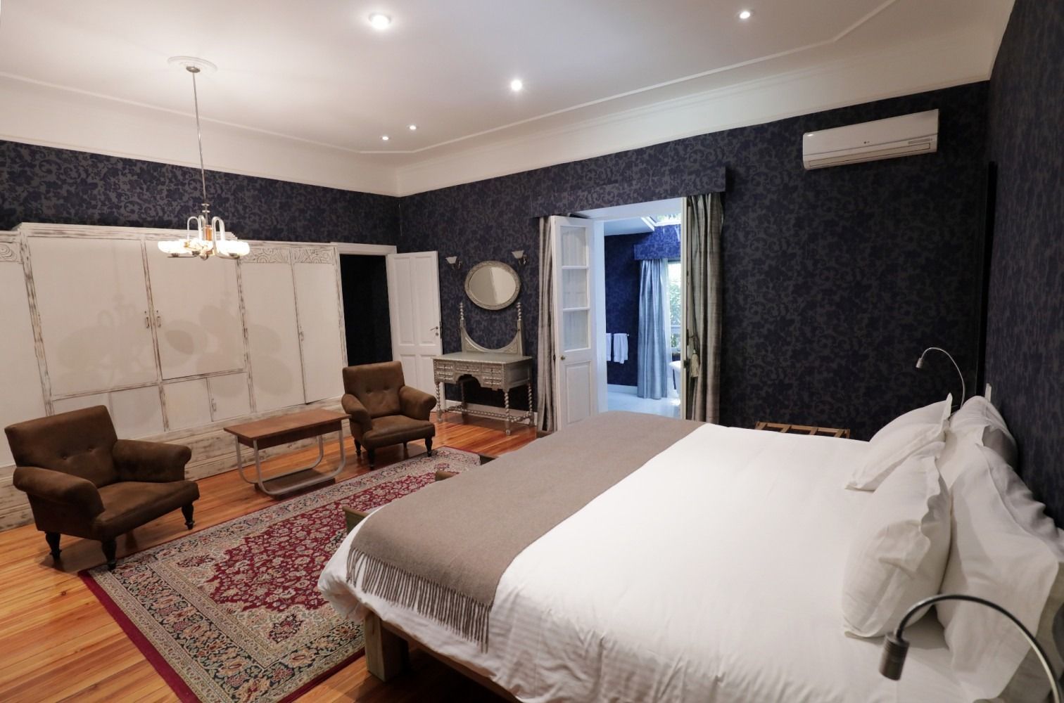 Located in the historic old house, this Classic Style Country Room offers an elegant and refined atmosphere with a distinctly Mendocinian heritage feel. Fully remodelled while preserving its original character, the room features d eep blue textured walls, polished wooden floors, and carefully selected classic furnishings that create a sense of warmth and sophistication.