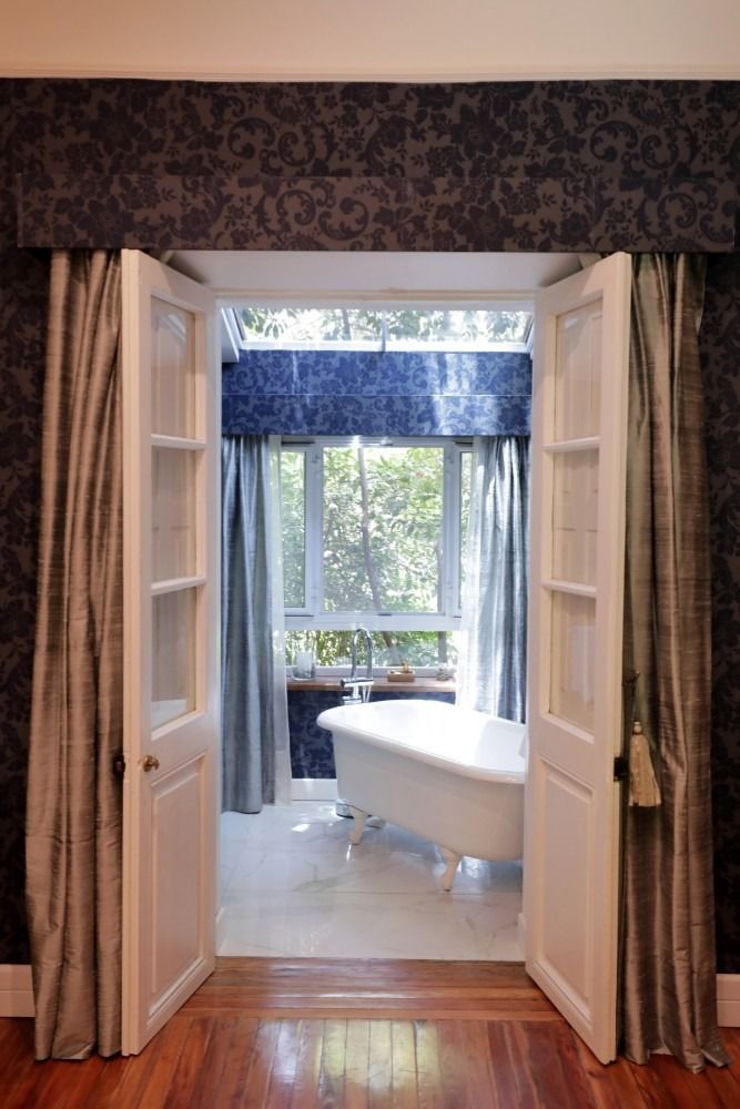 Large windows open toward the lush garden, bringing natural light into the rich interior palette. Heavy drapes, vintage rugs, and timeless design elements give the space a stately and serene ambiance, ideal for guests who appreciate style and tradition.