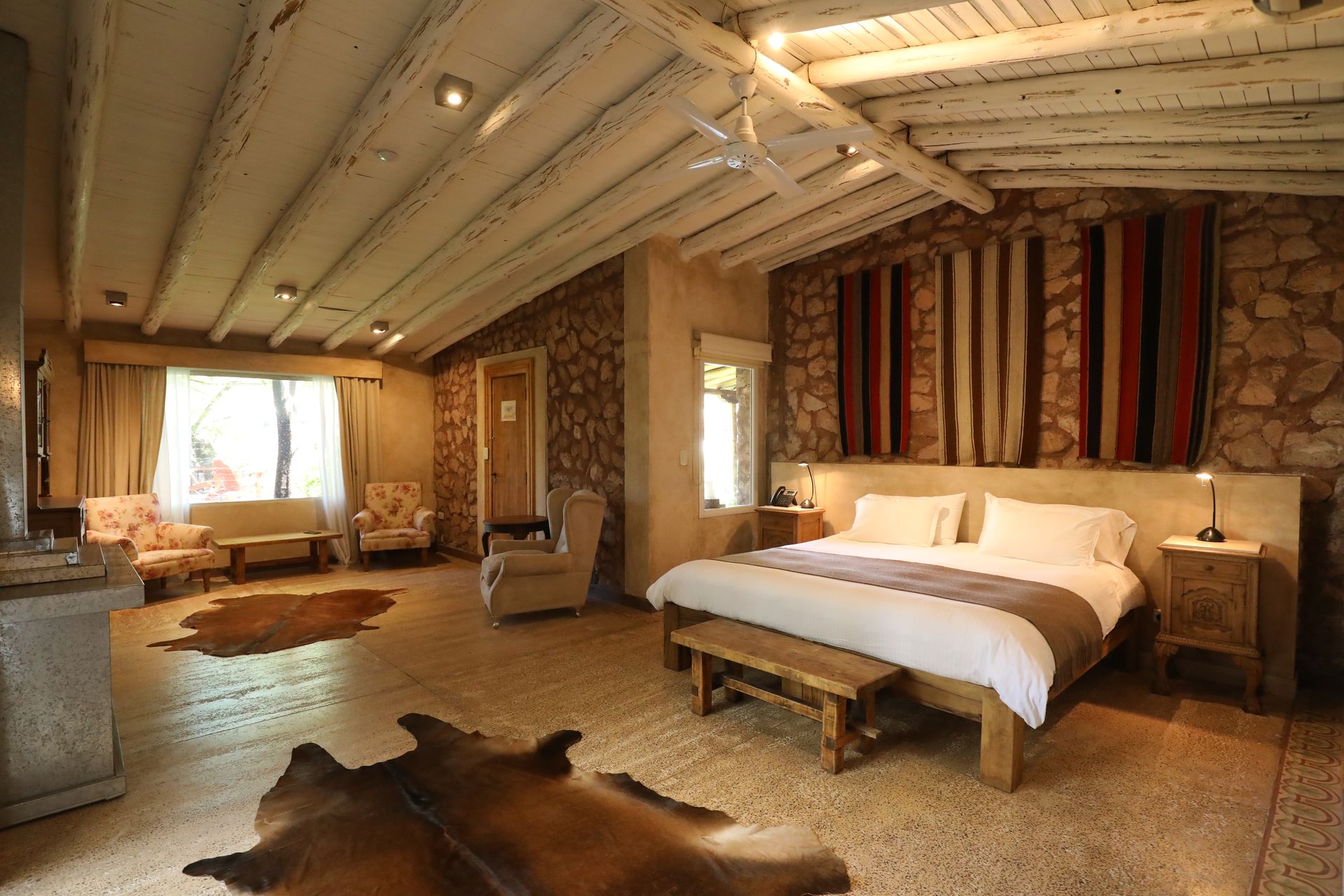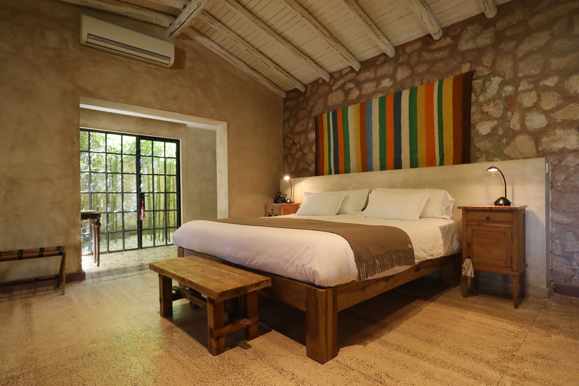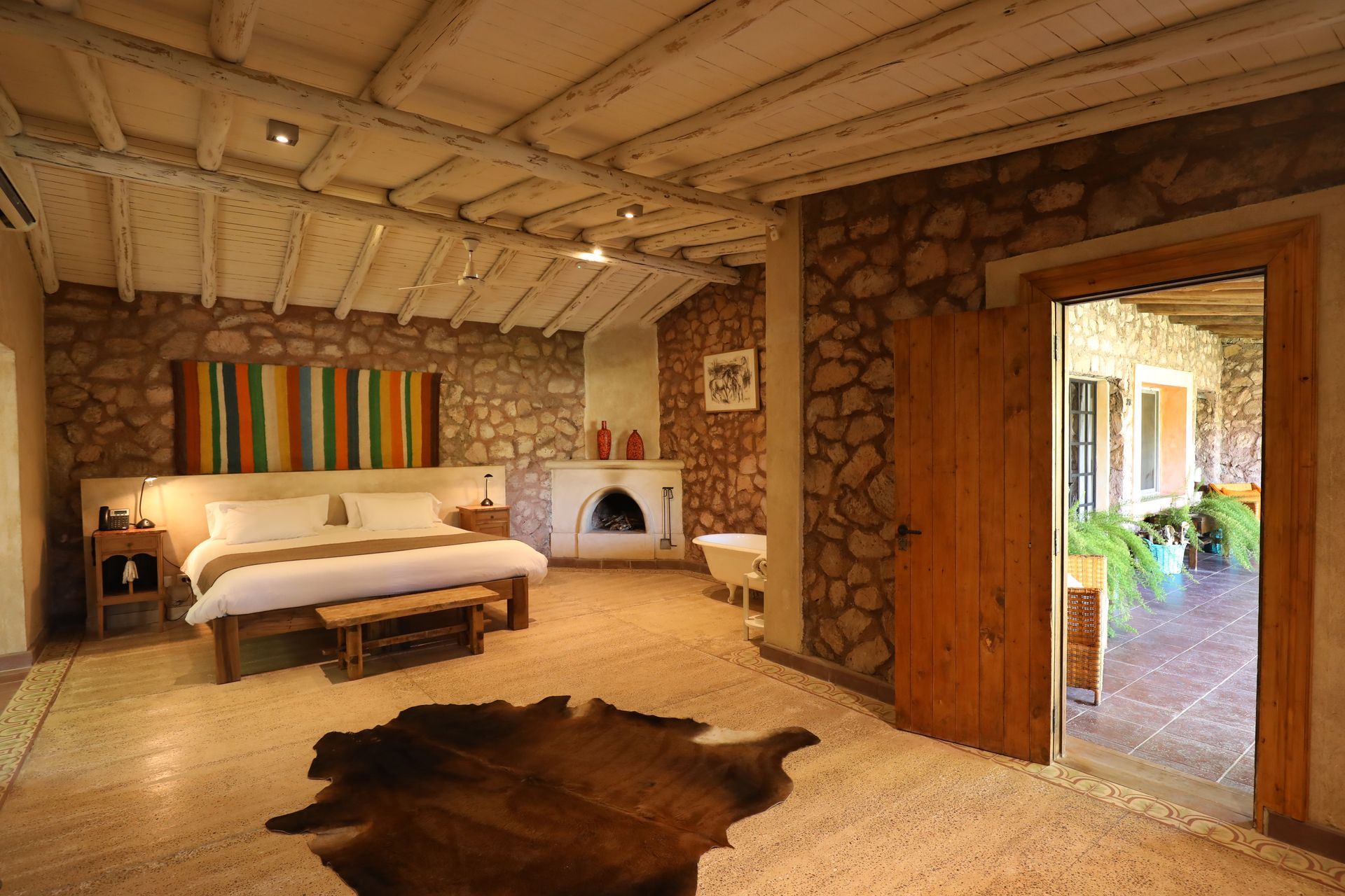 The original stone walls create a unique atmosphere, blending seamlessly with the surrounding countryside. Each suite includes a bathtub and a wood-burning fireplace, offering the perfect setting for deep relaxation after a day in Mendoza’s wine country.